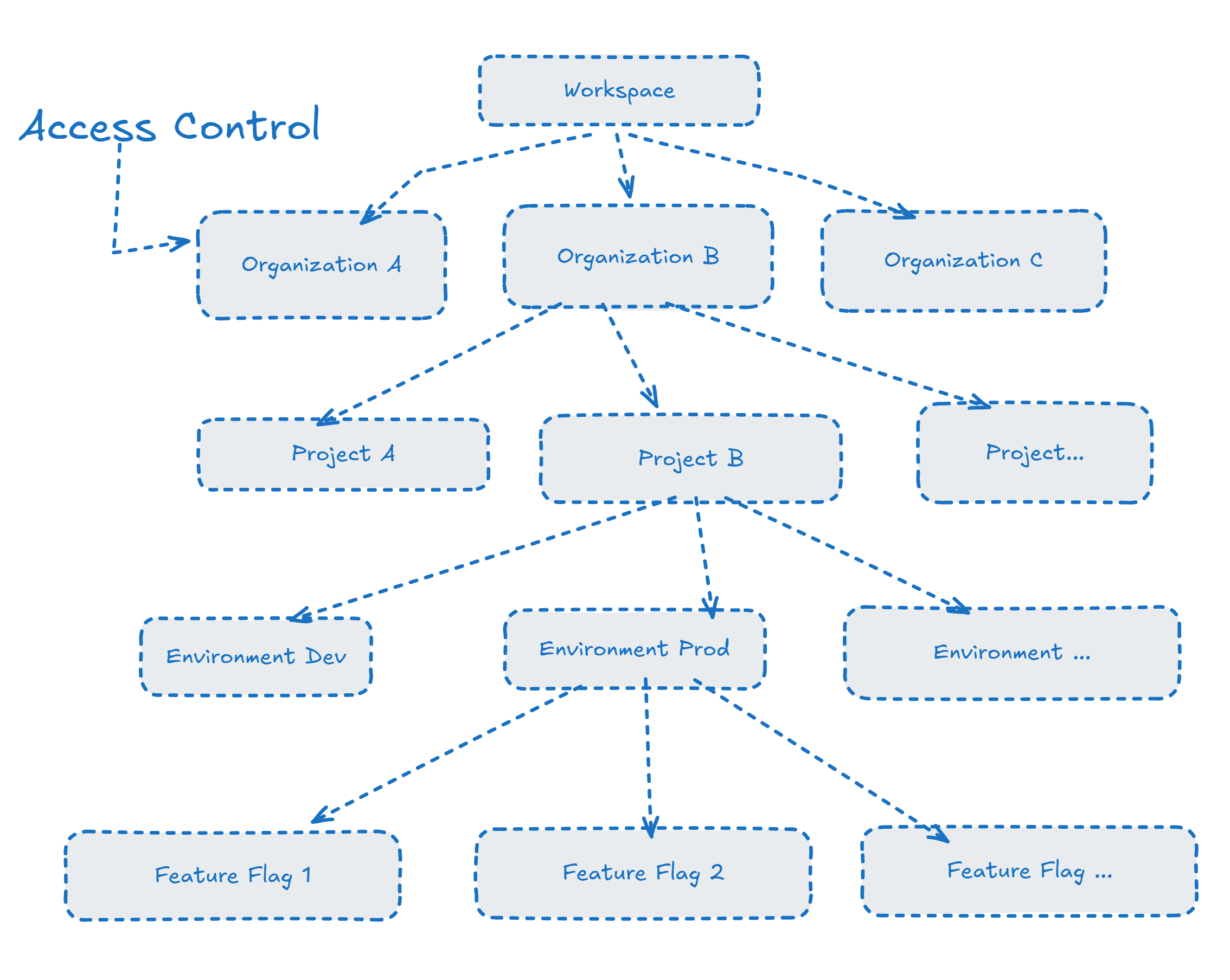 For the access control, we start at the organization level. You can control who can access the organization, projects under the organization, and environments under each project, and also the feature flags under each environment.