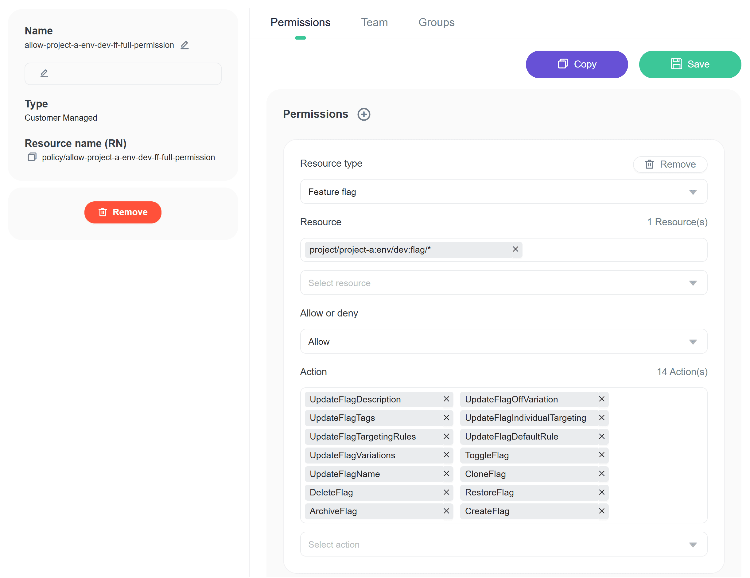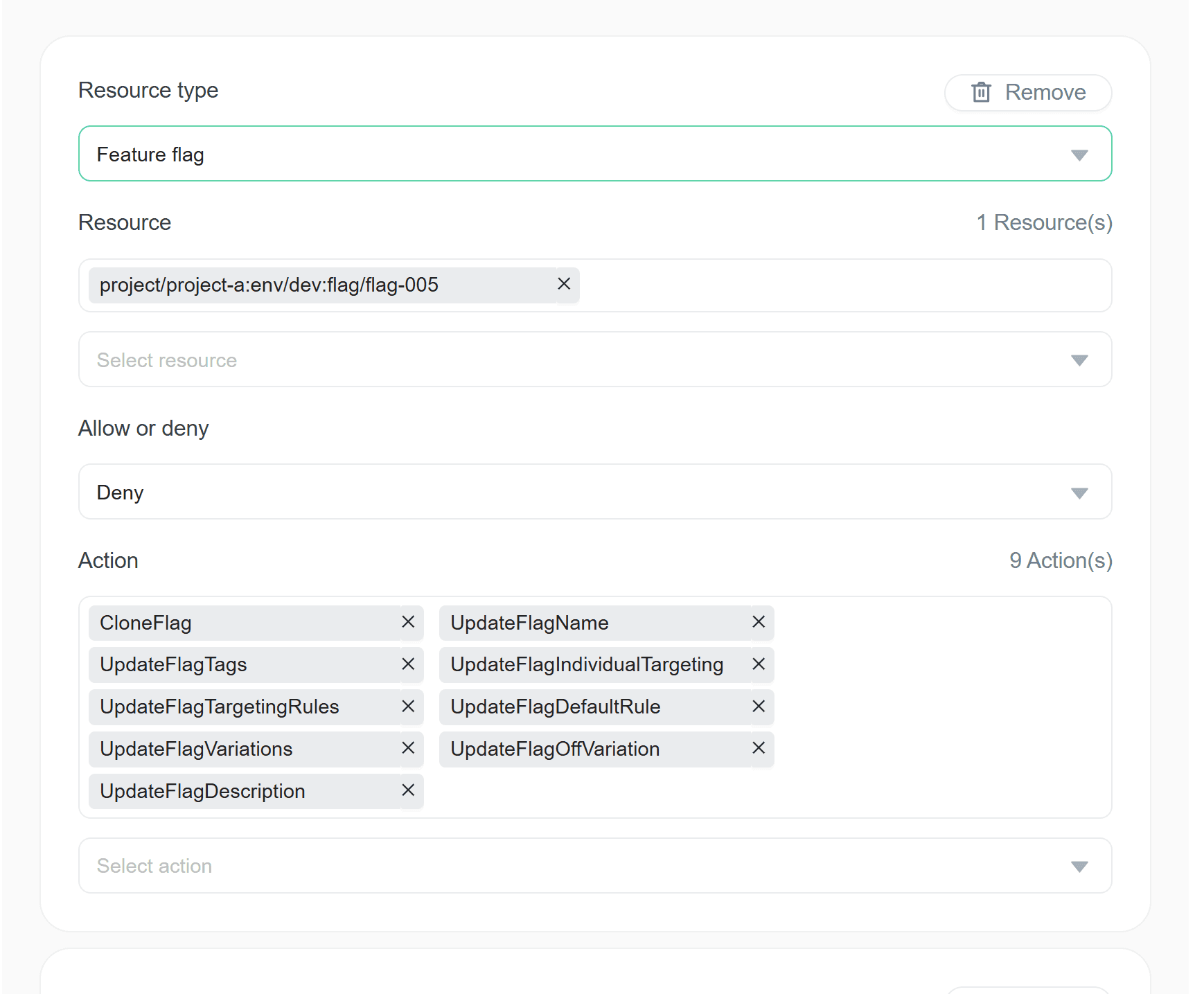 As shown above, we create a deny permission for a specific feature flag. You can select the actions that you want to deny for this feature flag.
