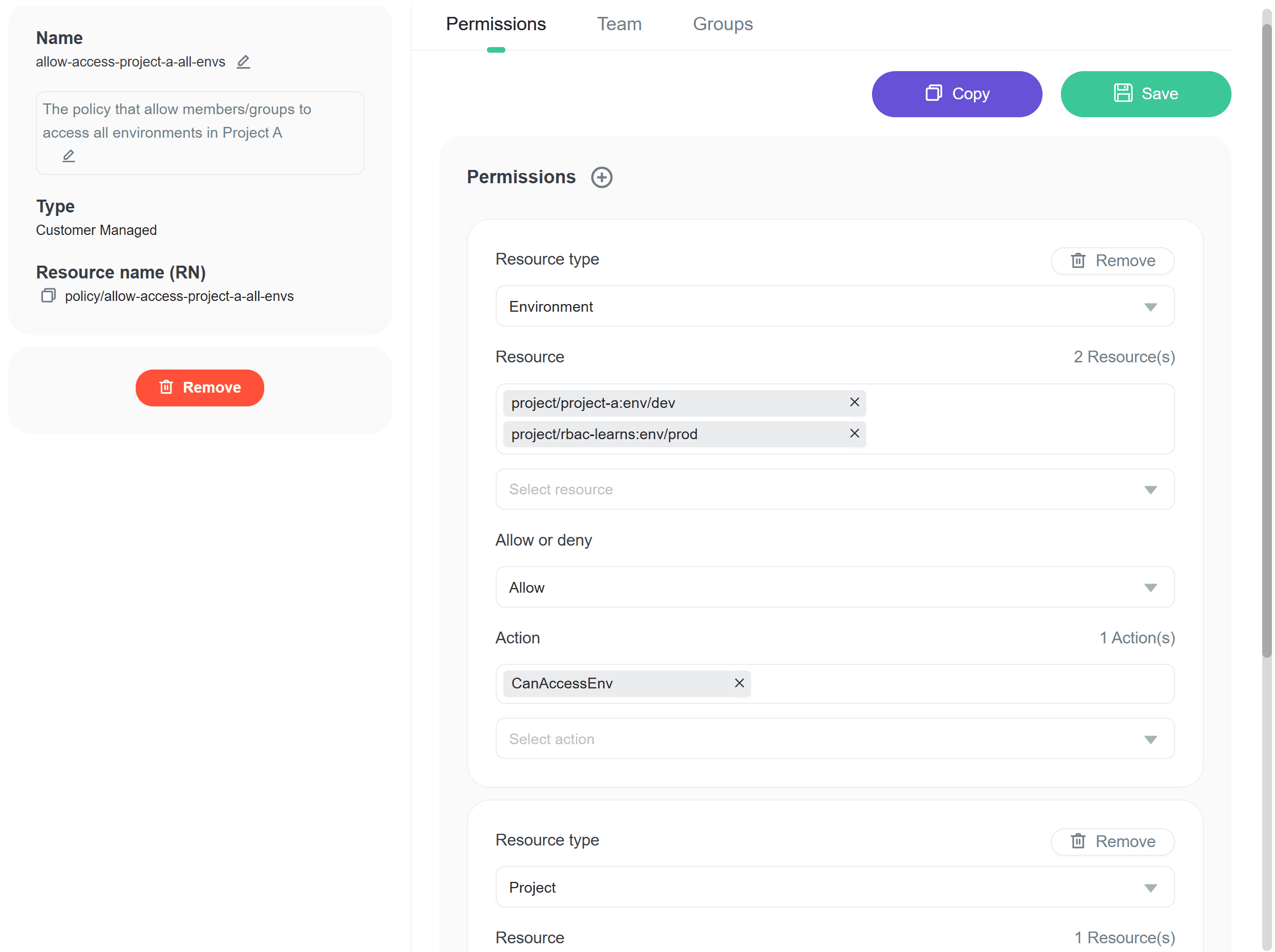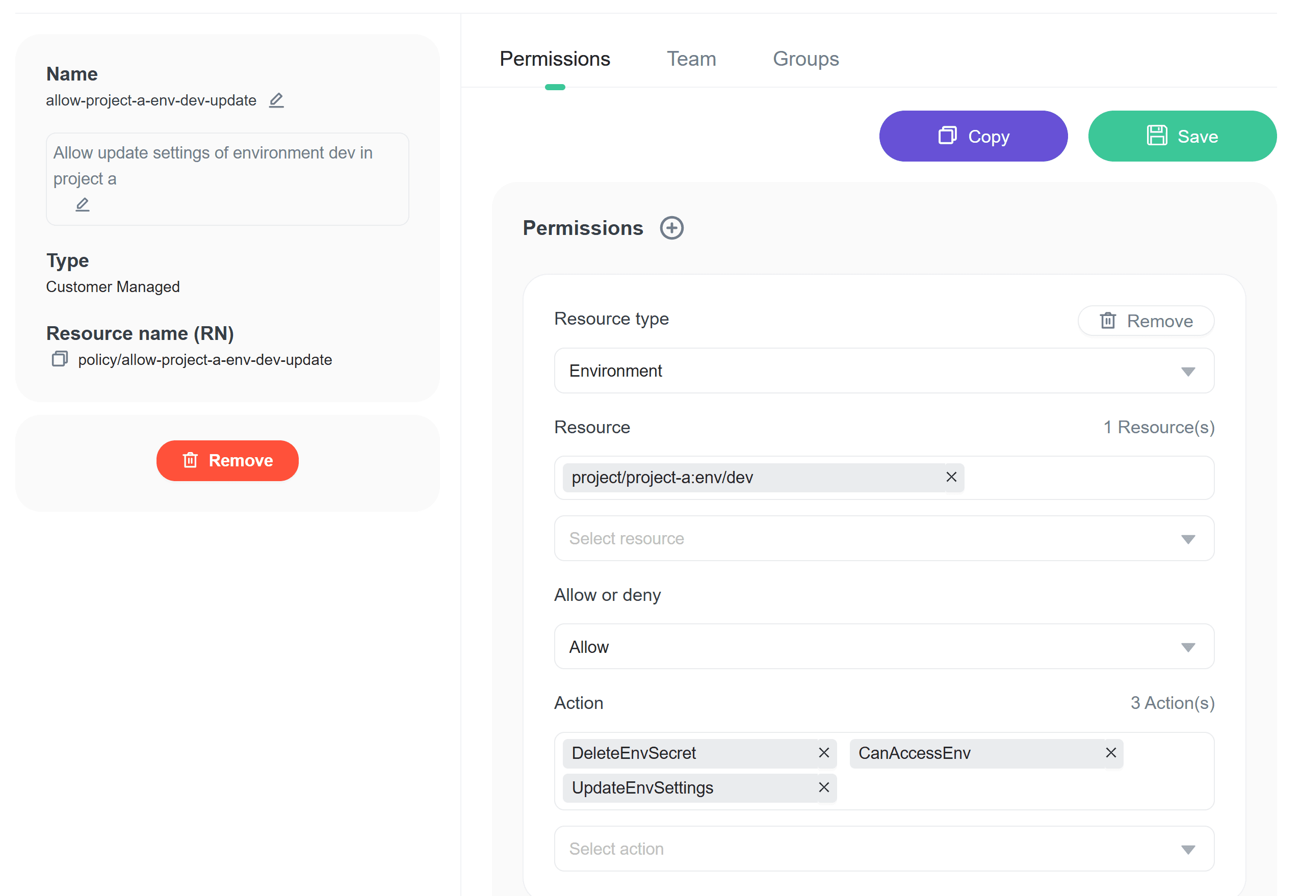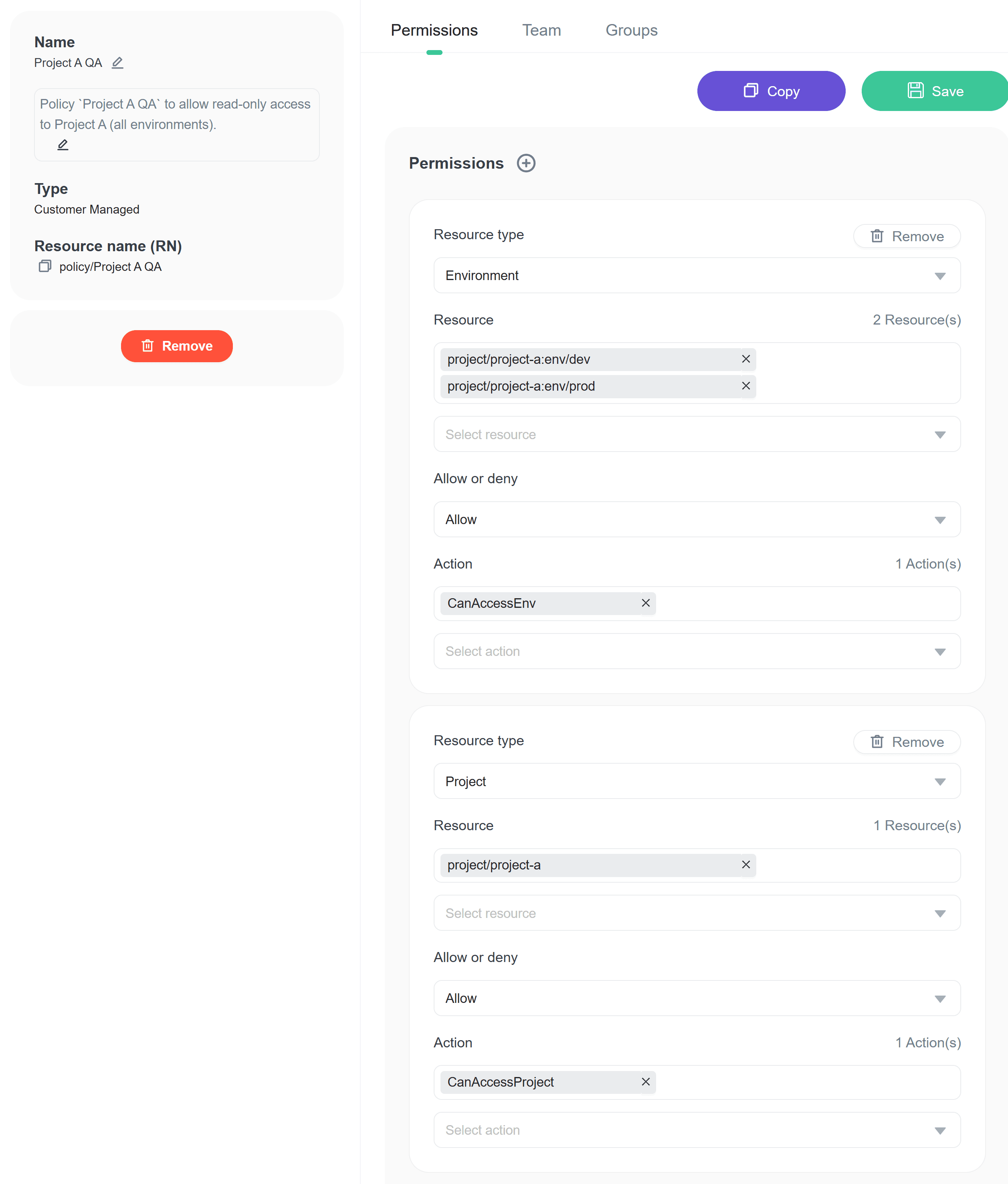 • Resource Selector/Editor: project/project-a:env/dev*, project/project-a:env/prod*
