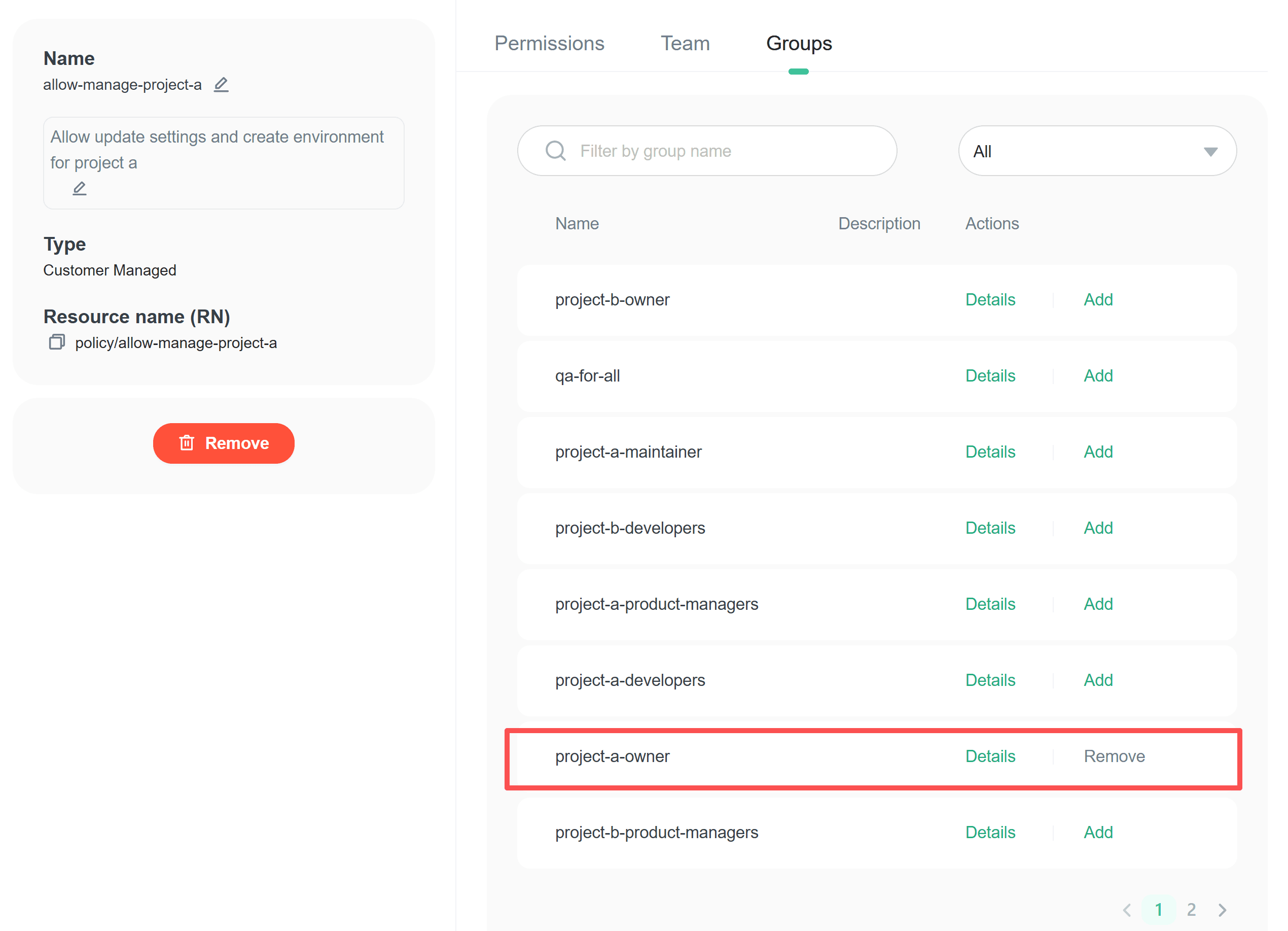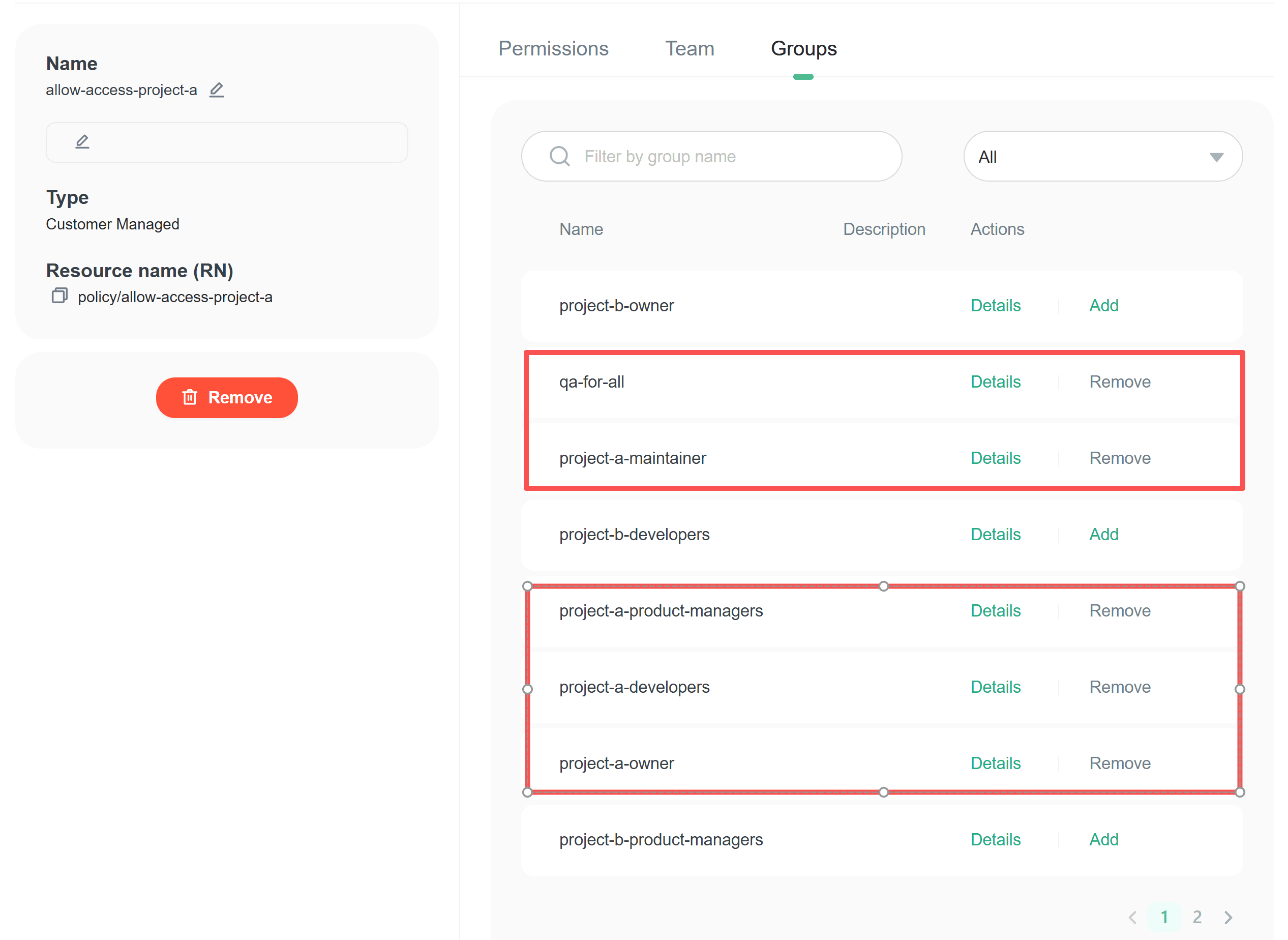 As shown in the picture above, we assign the policy/project-a-owner-full-permission policy to Project A Owner group. Because only project owner should have full management permissions for the project, such as deleting project.