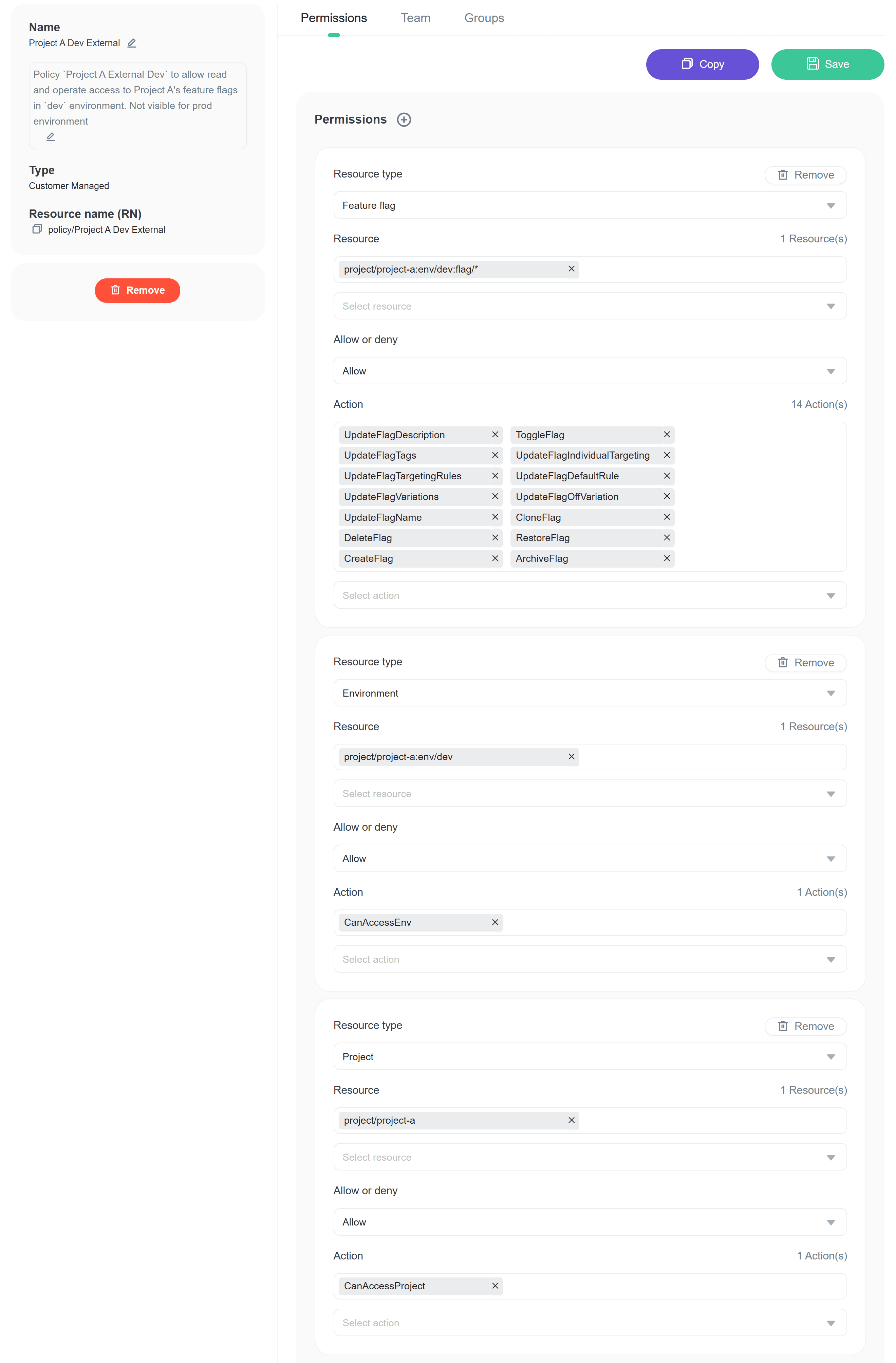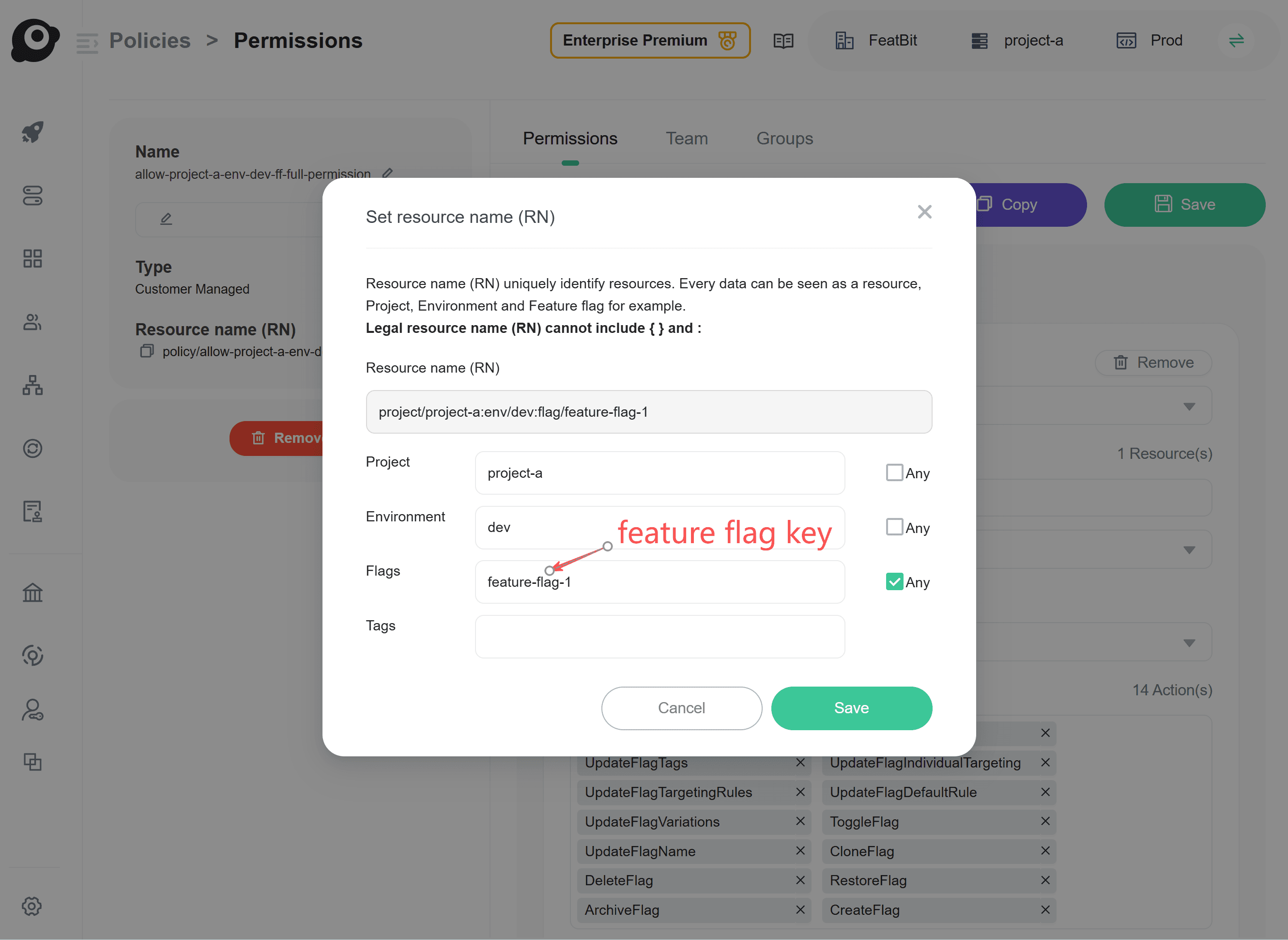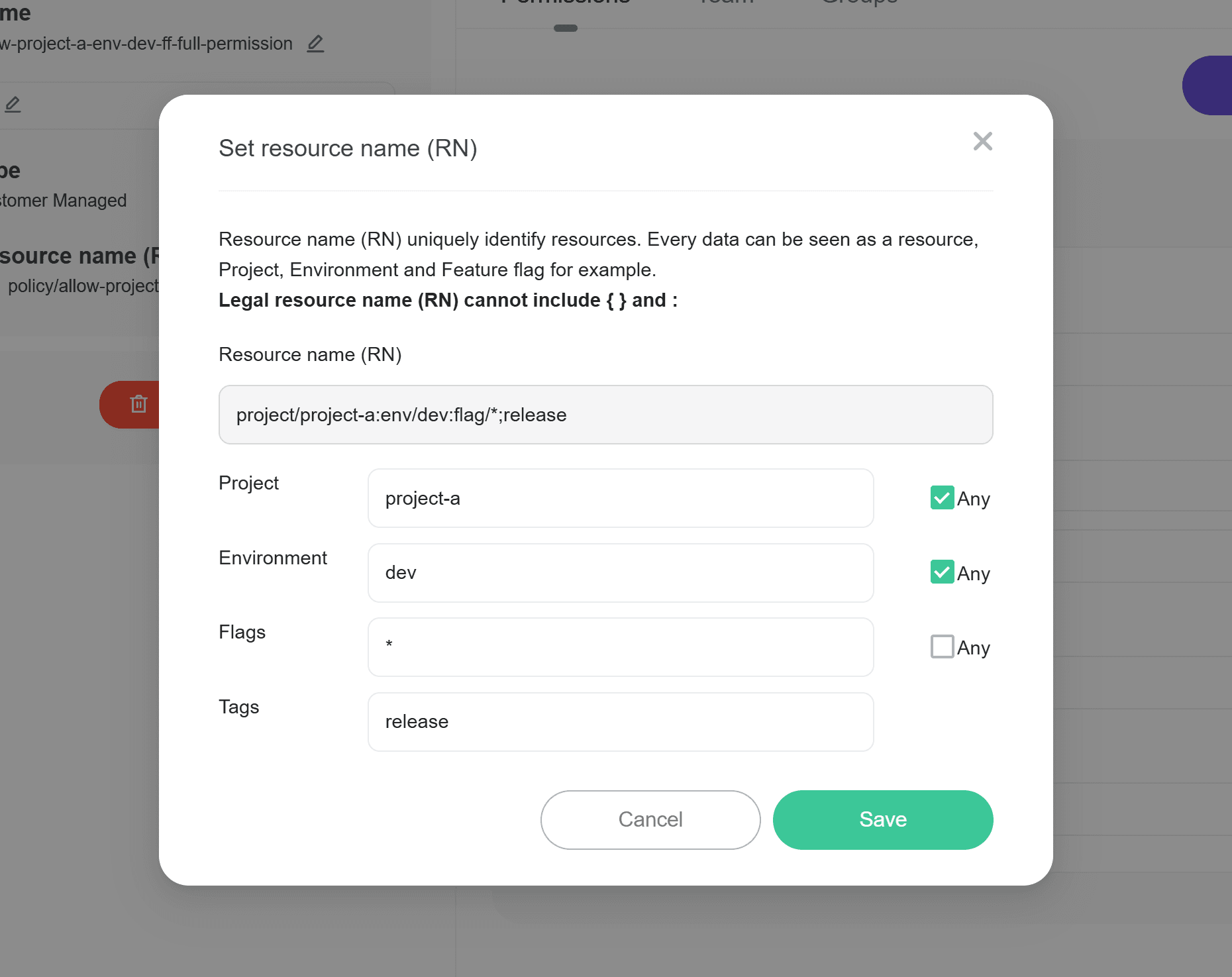• Only view feature flags in Project A, prod environment, and only allow to operate one specific feature flag.