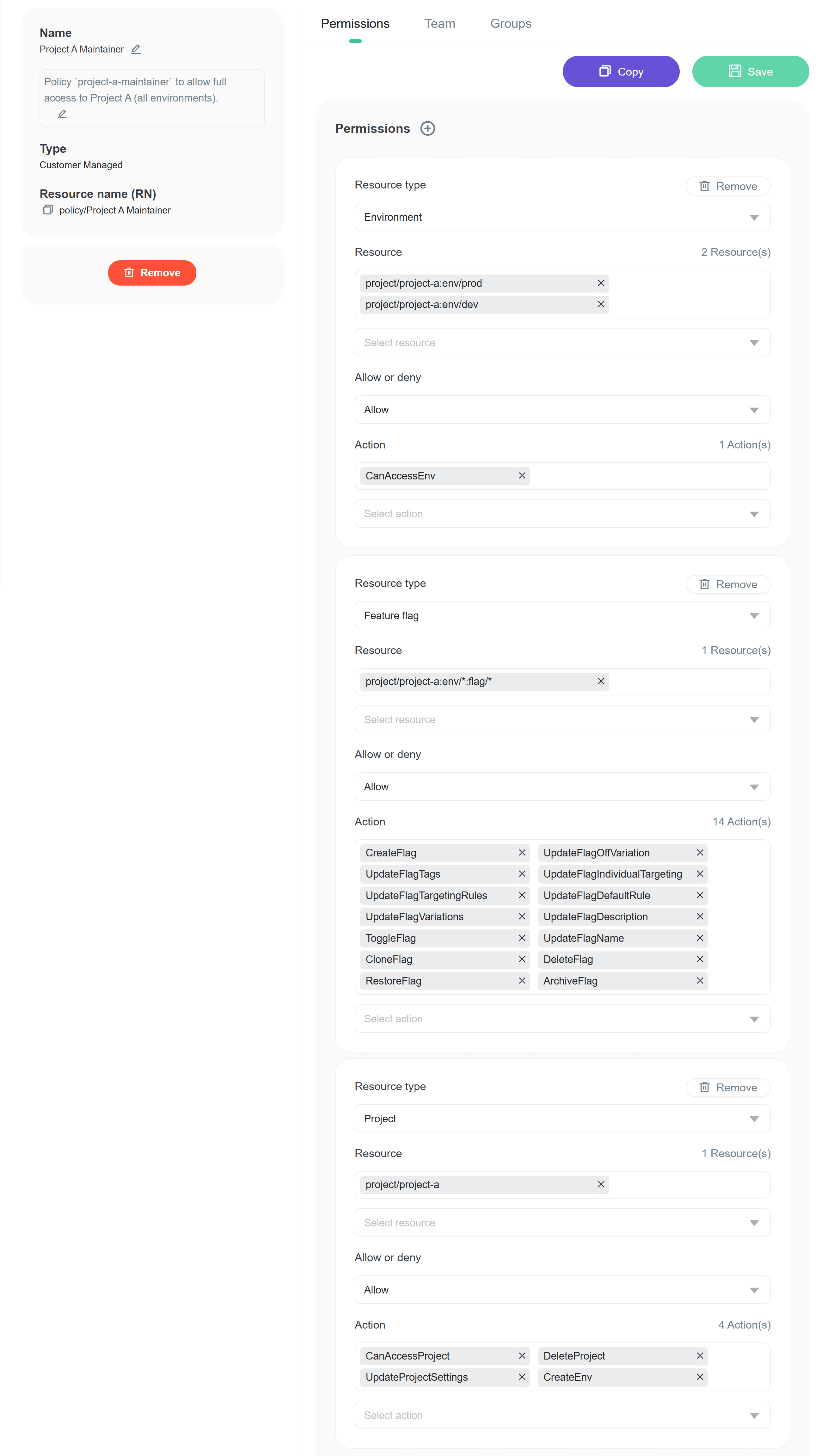 By following the above steps, we have successfully created and assigned policies to meet the access control requirements for Project A in our organization. Each group and member now has the appropriate permissions to access and manage feature flags according to their roles.