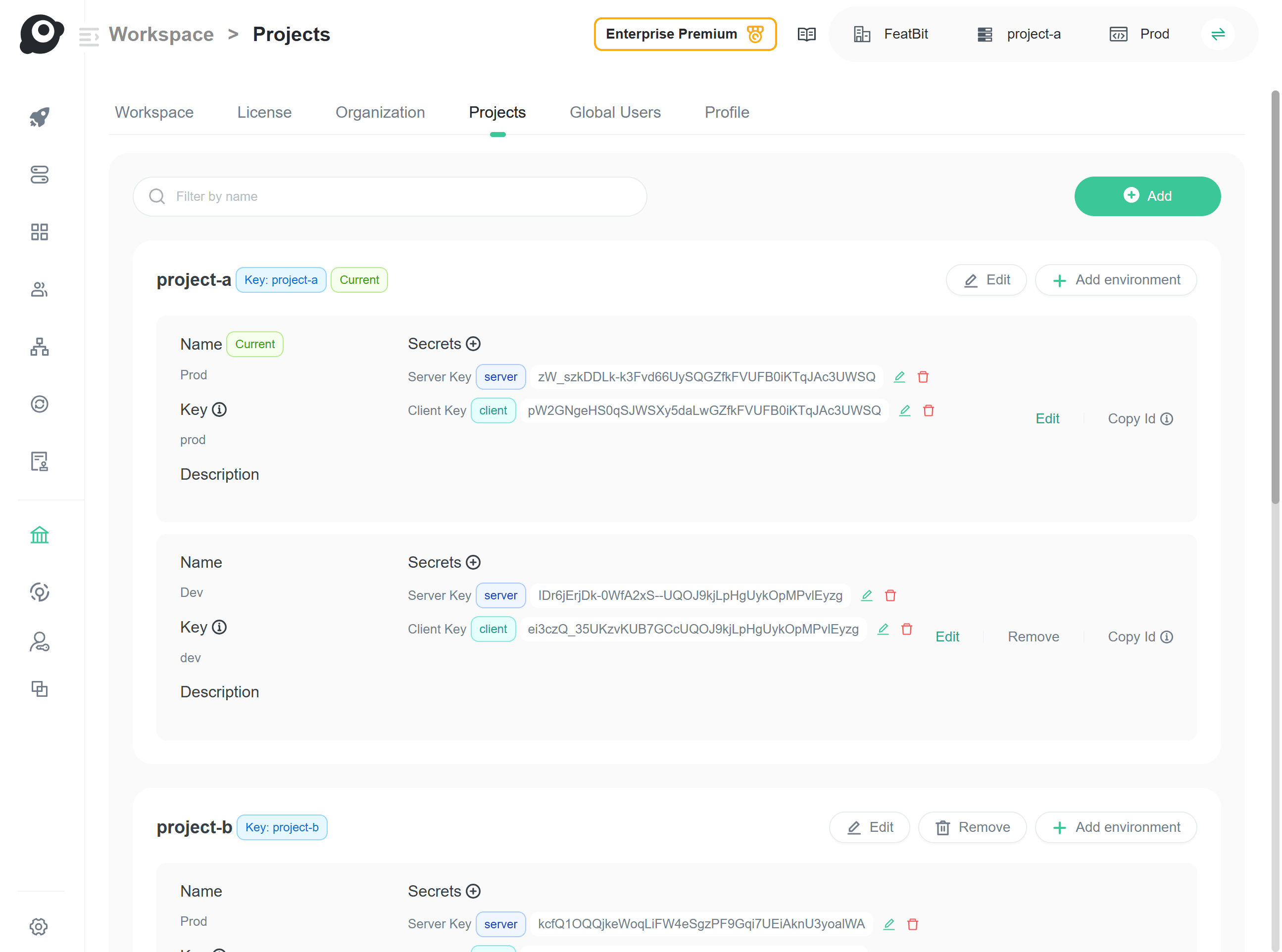 For each project, you can have multiple environments, such as development, staging, and production. You can also control who can access each environment and what management permissions they have for each environment.