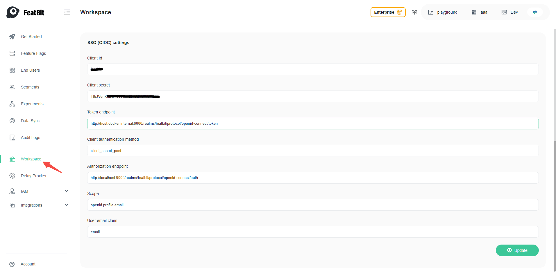 Go to http://localhost:8081/workspace (opens in a new tab) and add your OpenID Connect settings and click on Update, please replace the client secret with your own value